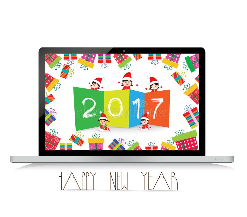 Buon Anno 2017 Con I Bambini Divertenti Del Computer Portatile Illustrazione Vettoriale Illustrazione Di Scheda Divertente 75571543