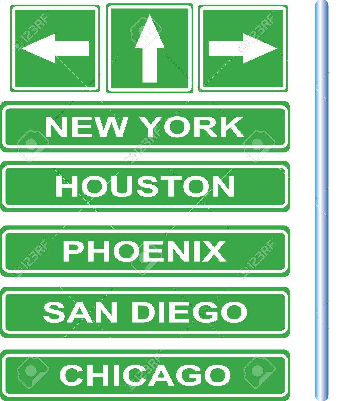 Immagini Stock Immagini Vettoriali Di Segnaletica Verde Con I Nomi Di 5 Citta E 3 Segno Con Le Frecce E Il Rack Di Disegno Per Il Montaggio Del Segno Image 85106455