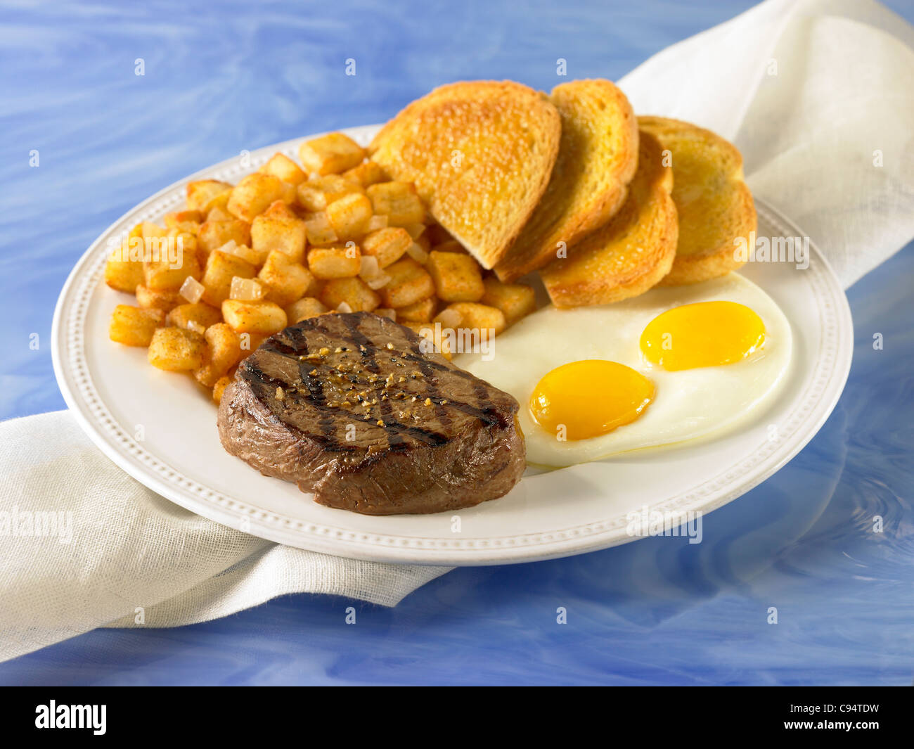 Una Bistecca Per Colazione Con Due Uova Patate E Toast Foto Stock Alamy