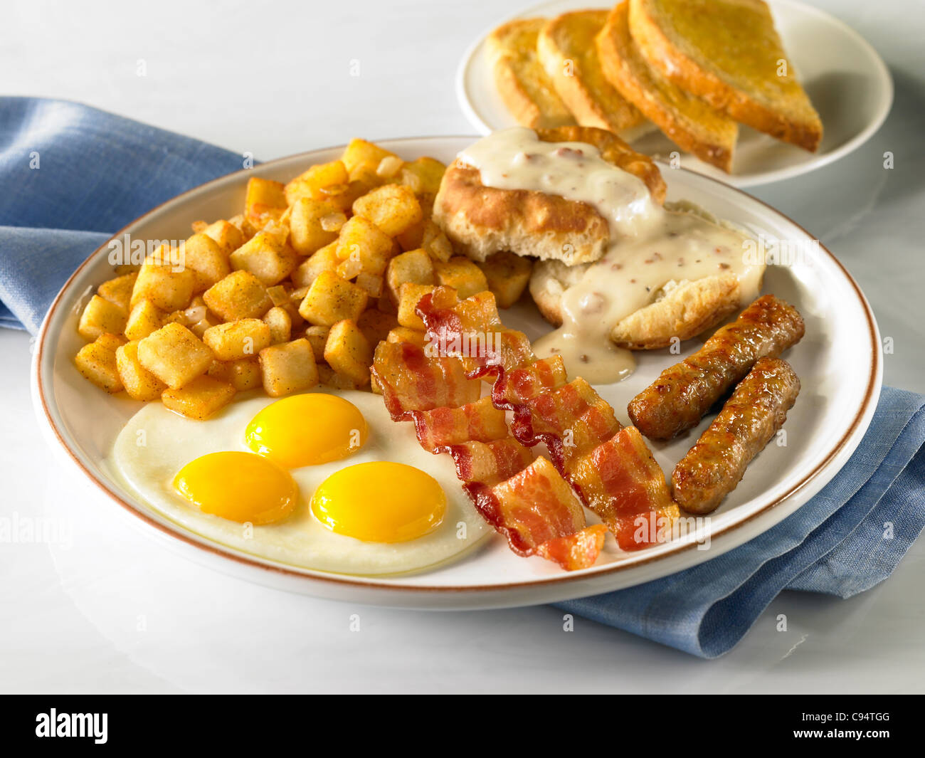 Un Paese Di Potenza Prima Colazione Con Tre Uova Pancetta Salsiccia Patate Biscotti E Toast Foto Stock Alamy