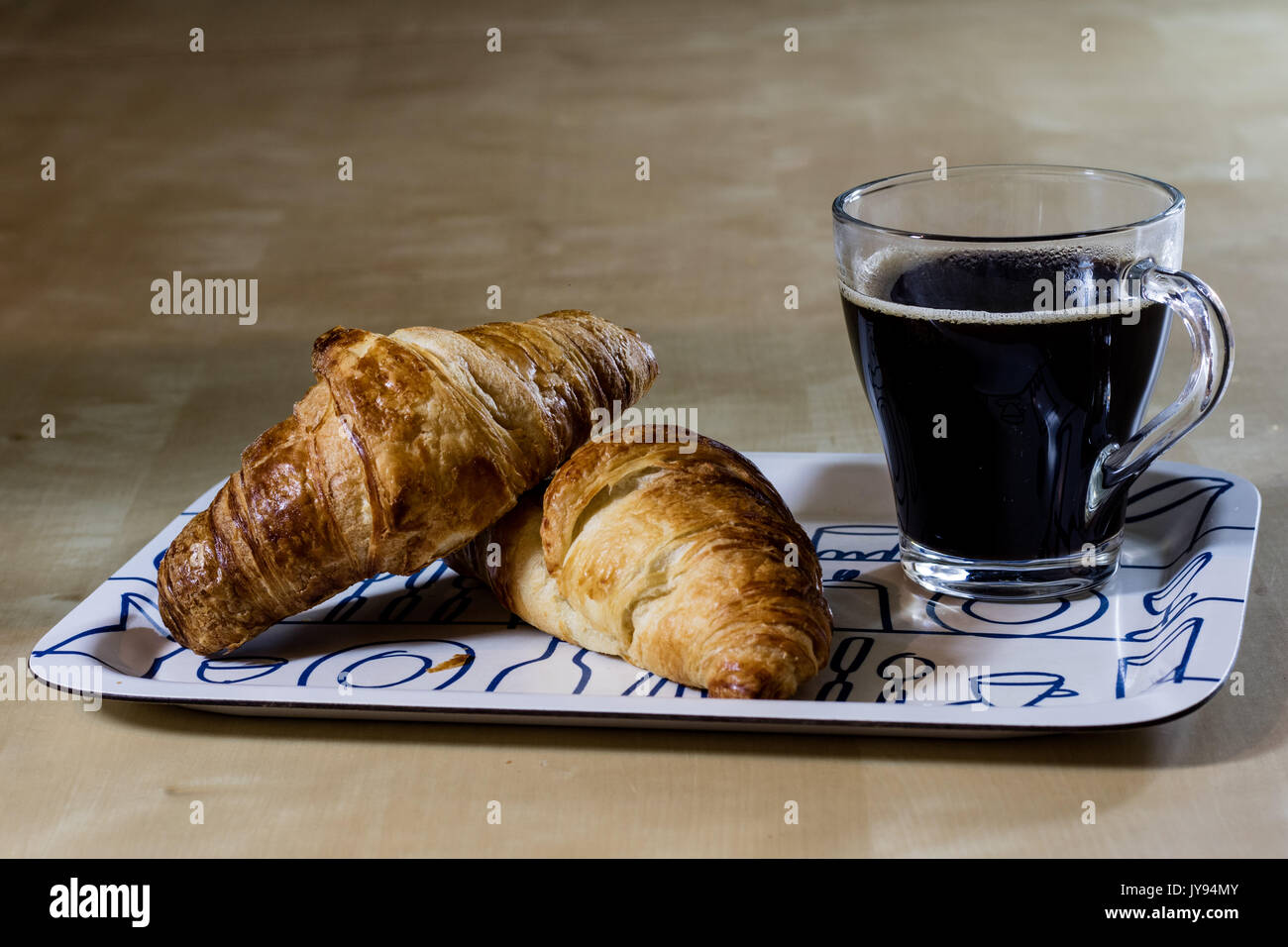 Il Caffe Caldo E La Colazione Sul Vassoio Tavolo In Legno Sfondo Nero Foto Stock Alamy