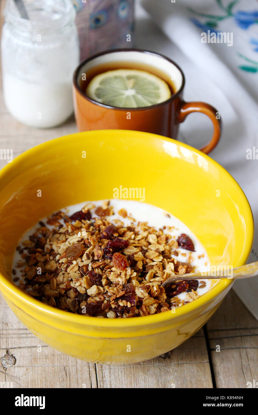 Muesli Fatti In Casa Con Yogurt E Te Con Limone Utile Colazione In Stile Rustico Il Fuoco Selettivo Foto Stock Alamy