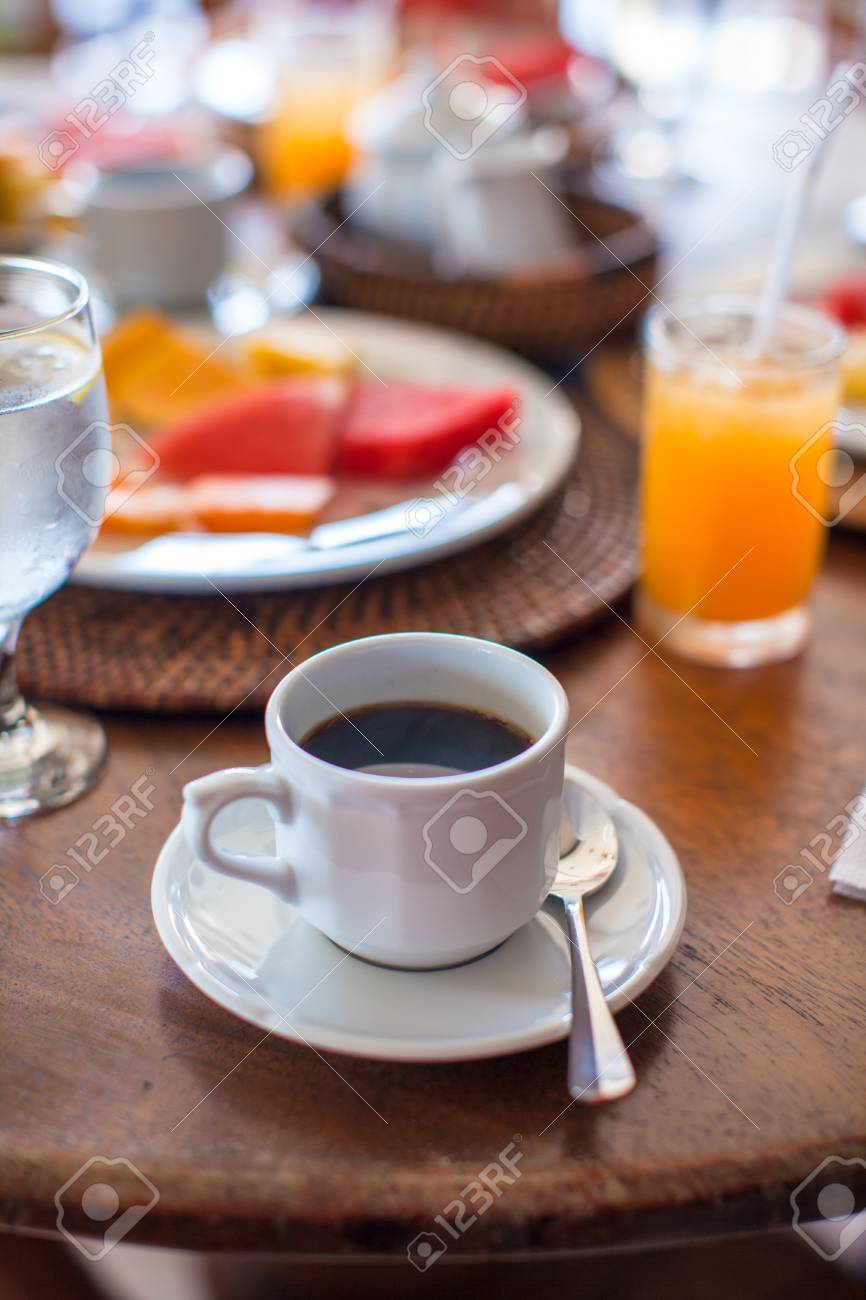 Immagini Stock Nero Caffe Succhi E Frutta Per La Prima Colazione In Un Caffe Nella Localita Image 23577594