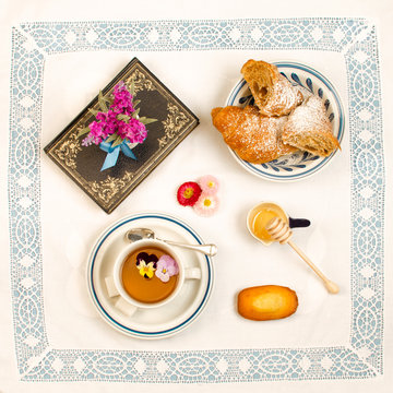 Concetto Prima Colazione Francese Tazza Di Caffe Romantica Bianca Rose E I Croissant Appena Sfornati Vista Dall Alto Foto Immagine Stock 243960672 Alamy