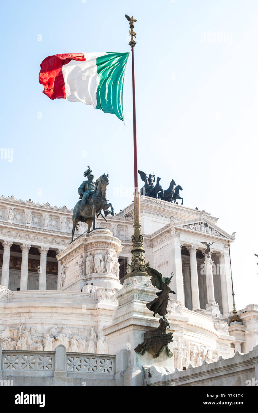 View Of Italian National Flag In Front Of Altare Della Patria Altar Of The Fatherland The Equestrian Sculpture Of Victor Emmanuel And Statue Of Th Stock Photo Alamy