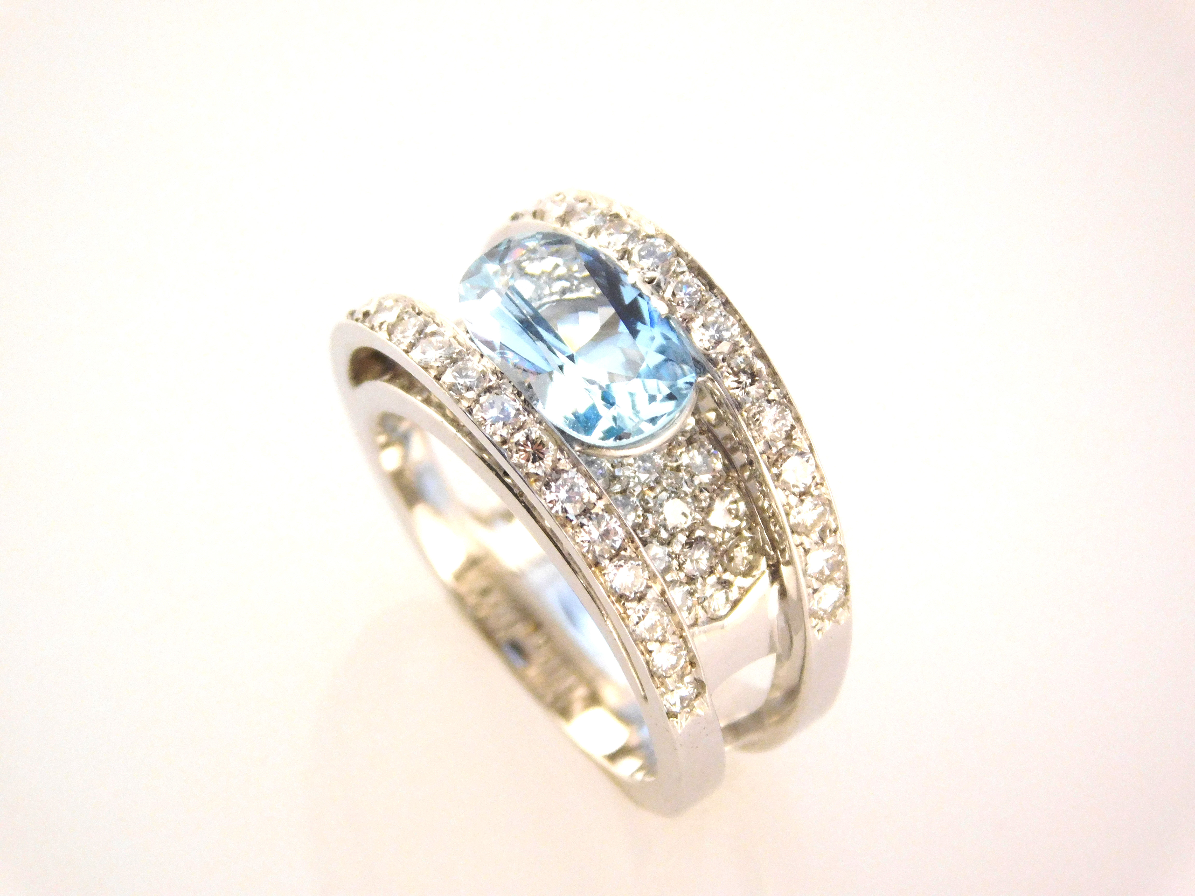 Anello Con Acquamarina Ovale E Doppia Fascia Di Diamanti Sul Gambo Gioielloro