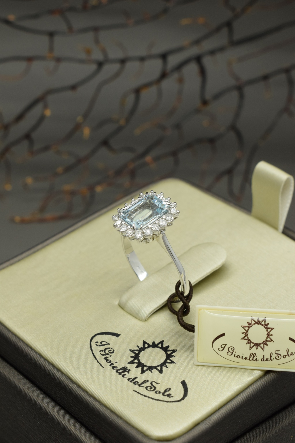 Anello In Oro Bianco Con Acquamarina Taglio Smeraldo E Diamanti Taglio Brillante Virano Gioielli