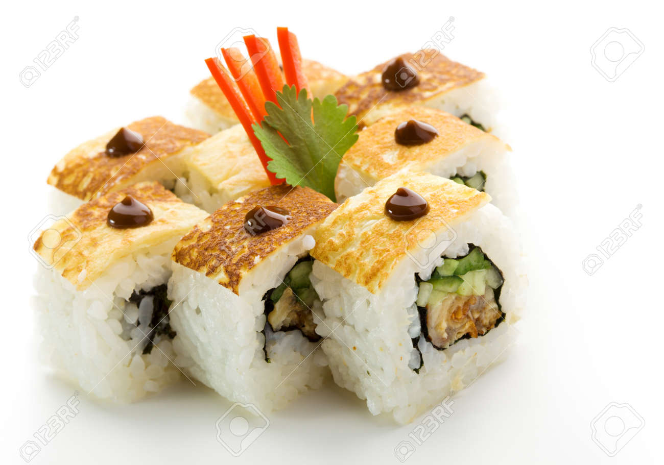 Immagini Stock Frittata Maki Sushi Roll Fatta Di Anguilla Affumicata Cetriolo E Spring Onion All Interno Condita Con Tamago Frittata Giapponese E Salsa Image 7772924