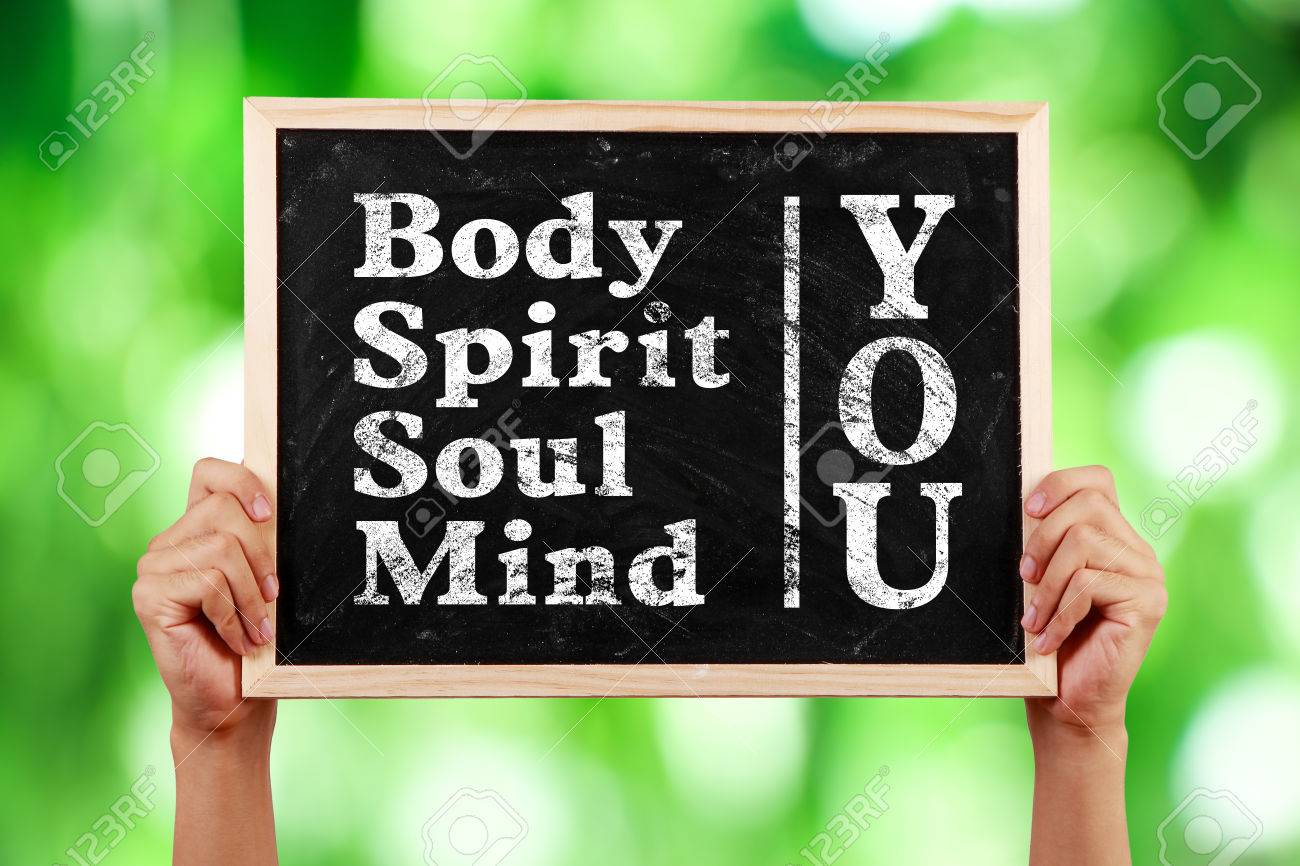 Immagini Stock Mani Che Tengono Lavagna Con Testo E Corpo Spirito Anima Mente Contro Sfondo Verde Offuscata Image 44381436
