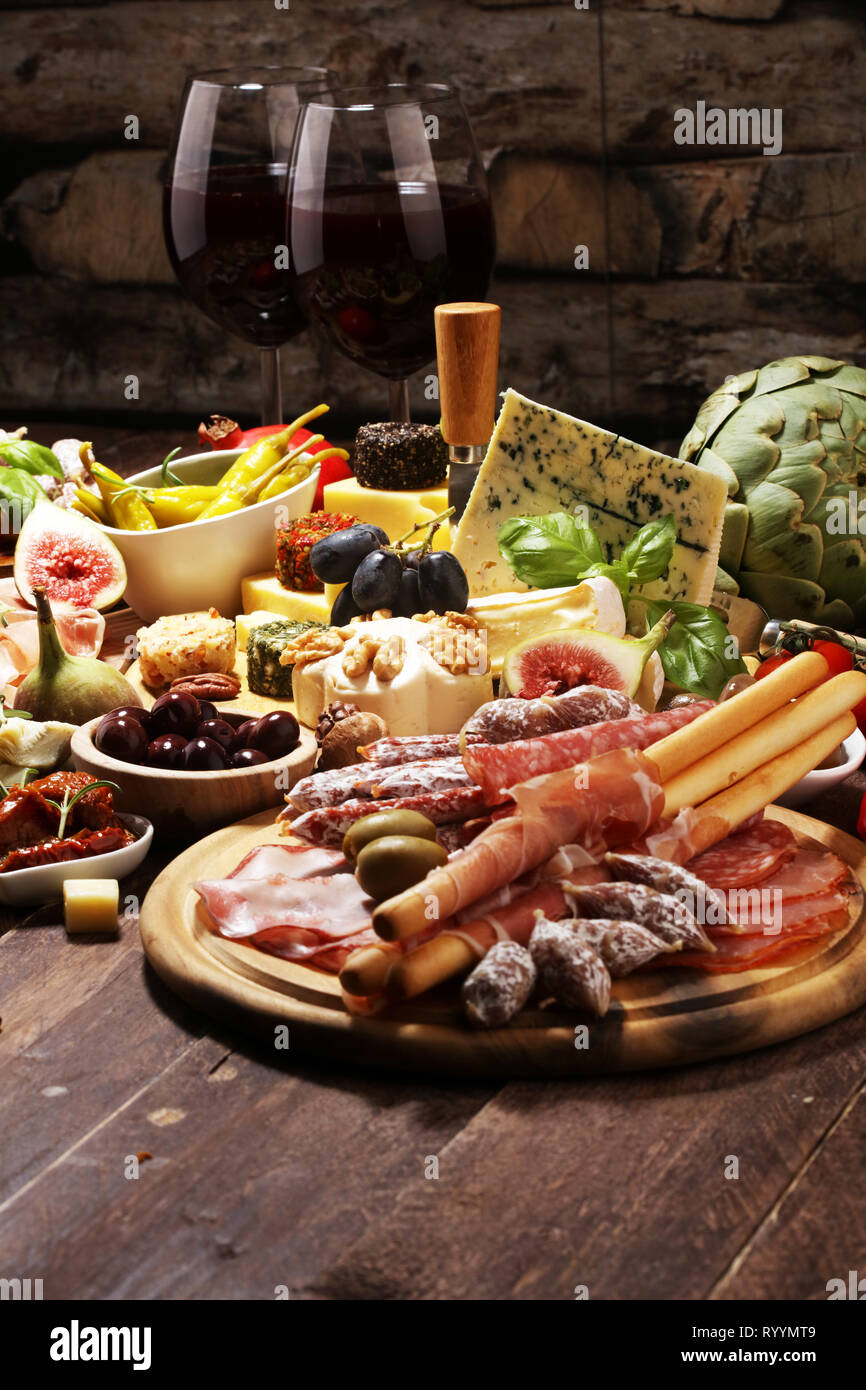 Italian Antipasti Wine Snacks Set Cheese Variety Mediterranean Olives Crudo Prosciutto Di Parma Salami And Wine In Glasses Over Wooden Grunge Bac Stock Photo Alamy