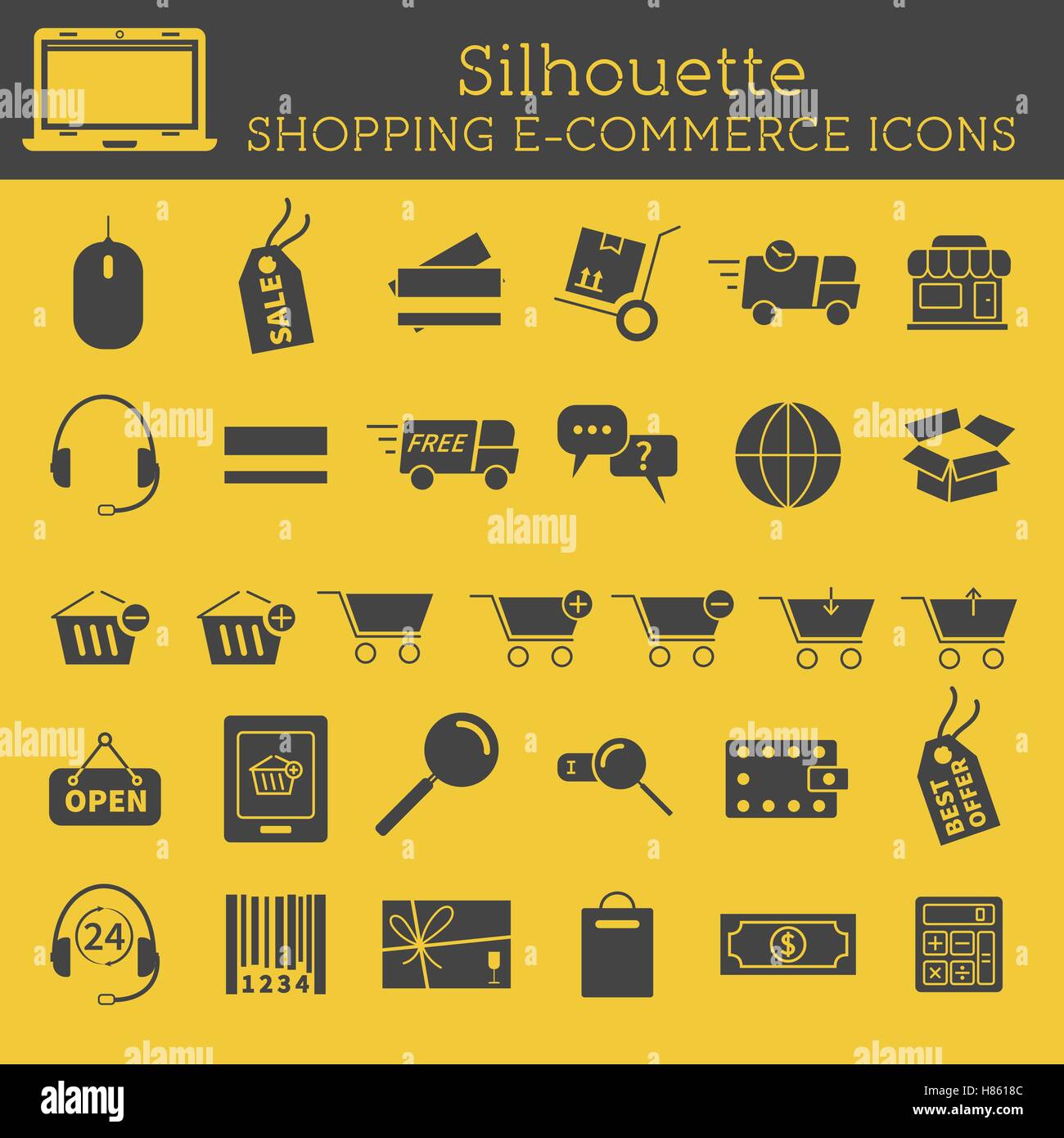 Set Di Silhouette Shopping Online Icone Isolato Su Sfondo Giallo Possono Essere Utilizzati Come Elementi Nel Infographics Web E Mobile App Icone Etc Facile Per Ricolorare E Ridimensionare Illustrazione Vettoriale Immagine E