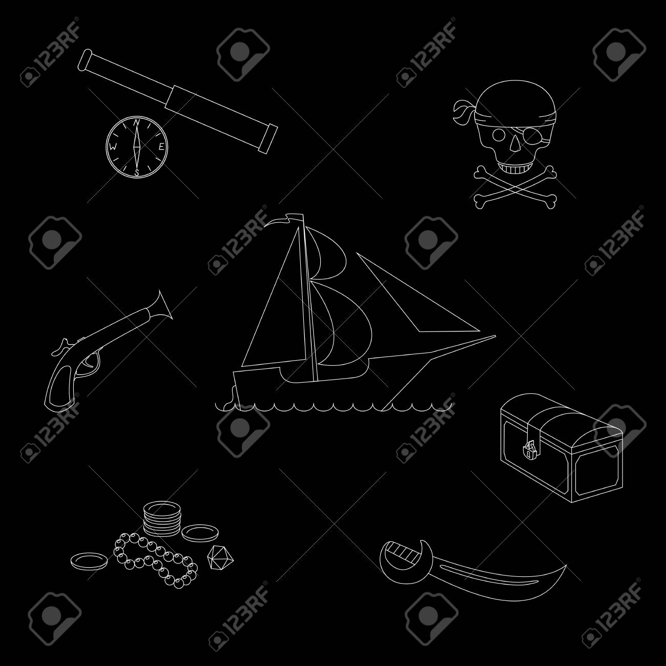 Vettoriale Figure Illustrazione Tema Dei Pirati Profilo E Impostato Su Sfondo Nero Tra Cui Nave Pirata Il Petto I Tesori Sparsi Sciabola Pistola Il Telescopio Bussola E Teschio Con Le Ossa