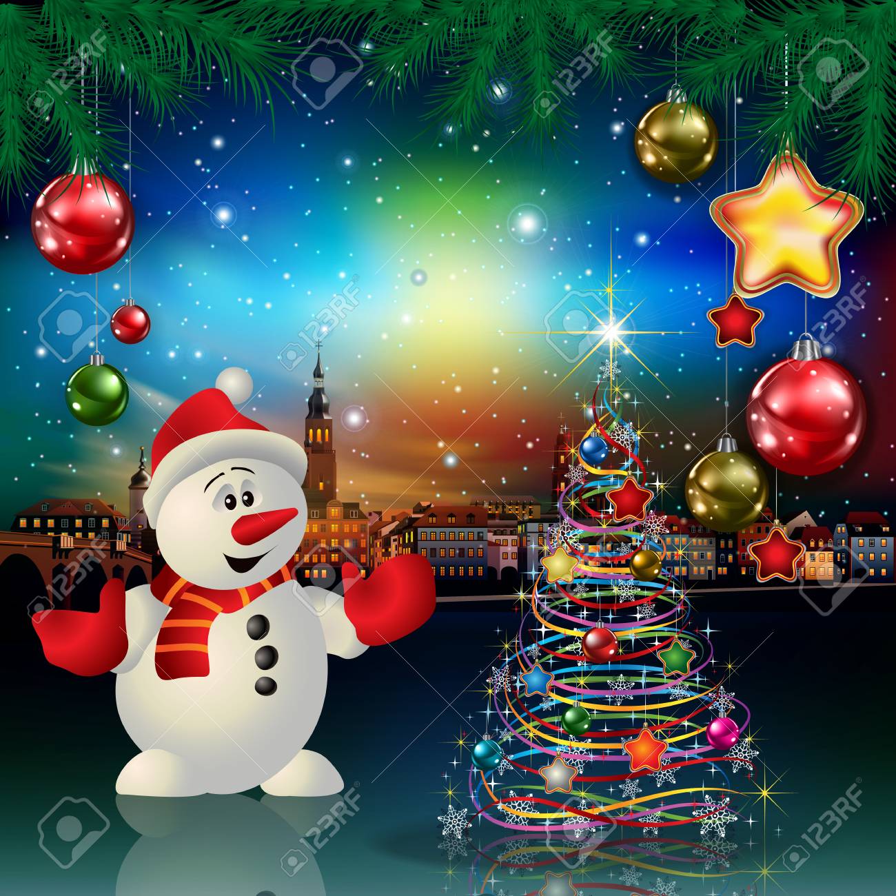 Vettoriale Auguri Di Natale Con Panorama Della Citta E Del Pupazzo Di Neve Image 67575489