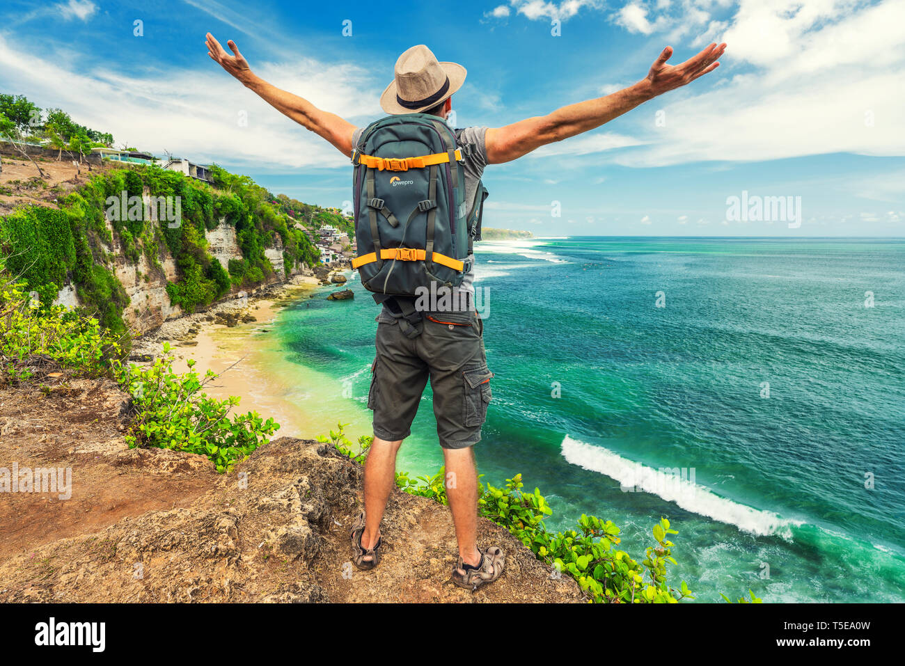 Uno Stile Di Vita Attivo Backpacker Viaggiatori Con Zaino Fotografico Lowepro Mani Alzate Godendo Della Vista Panoramica Natura Paesaggio Isola Bali Indonesia Foto Stock Alamy