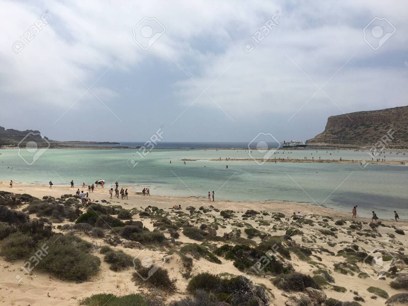 Immagini Stock A Beautiful Beach Of Balos At Crete Island In Greece In A Cloudy Weather Tourists Are Relax And Bath In Clear Water Of Balos Beach Image 129465188