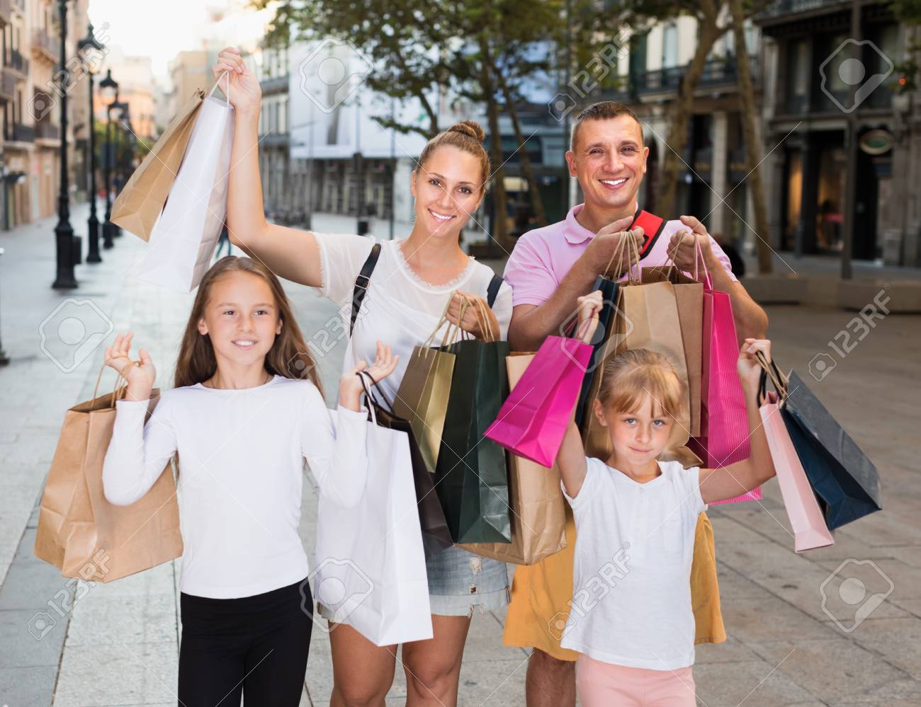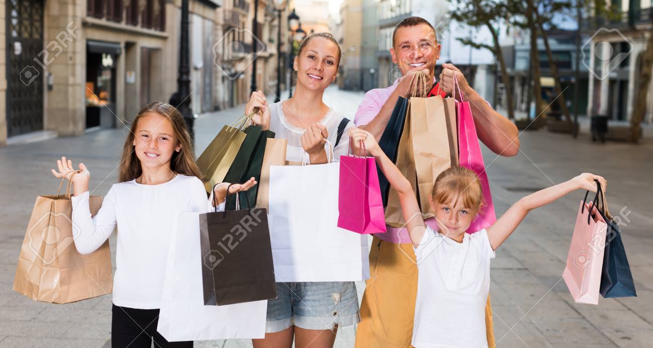 Immagini Stock Famiglia Positiva Con I Bambini Che Sorridono E Che Tengono I Sacchetti Della Spesa Nella Citta Image 90460543