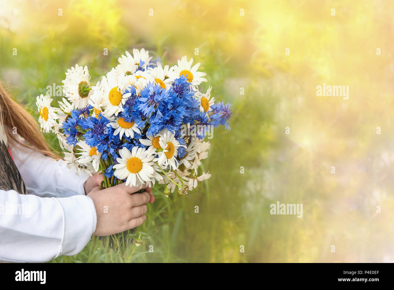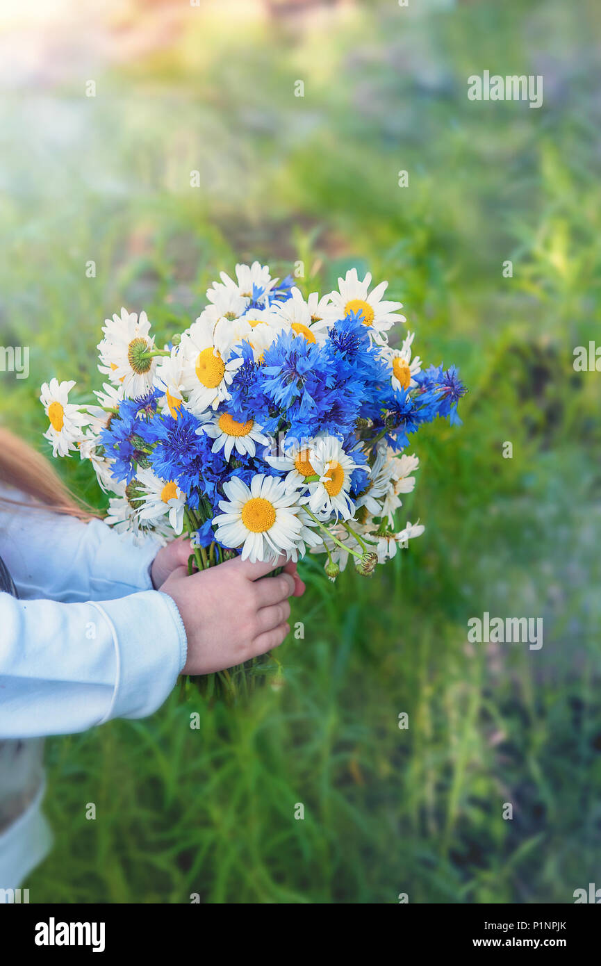 I Bambini Con Le Mani In Mano Tenendo Un Mazzo Di Fiori Di Campo E Margherite Cornflowers Su Un Verde Sfondo Sfocato Copia Dello Spazio Allergia Polinosis Foto Stock Alamy