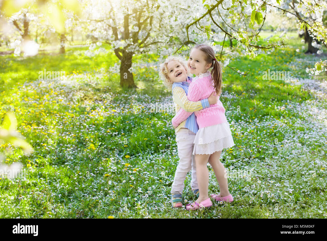 Bambini Che Giocano Nella Fioritura Cherry Blossom Garden Piccolo Ragazzo E Ragazza Con Fiori Di Primavera Nel Frutteto Uovo Di Pasqua Caccia In Apple Tree Farm La Ciliegia F Foto Stock