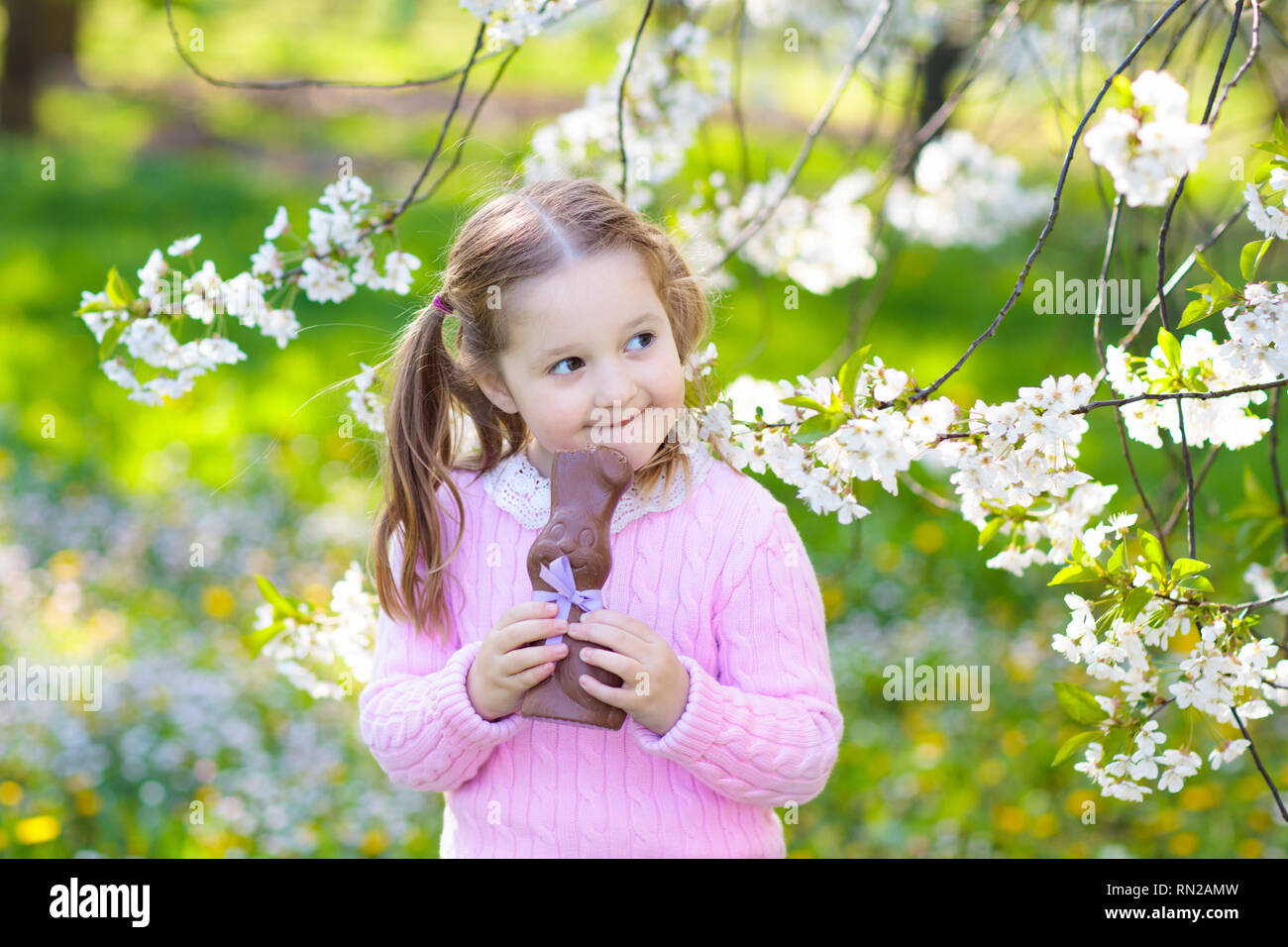 I Bambini Con Orecchie Di Coniglietto Di Pasqua Caccia All Uovo In Dei Ciliegi In Fiore Giardino Bambina Mangiando Cioccolato Coniglio Fiori Di Primavera E Le Uova Nel Paniere Frui Foto Stock