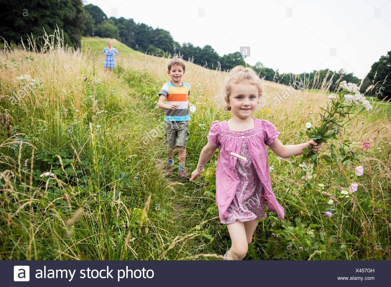 Madre Con I Bambini A Caccia Di Fiori Nel Prato Foto Stock Alamy