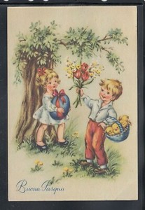 Buona Pasqua Vintage Cartolina Augurale Con Bambini Fiori Di Pesco Pulcino Cartolina Di Pasqua Cartoline Vintage