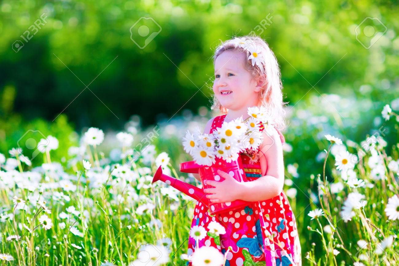 Immagini Stock Giardinaggio Di Capretto La Bambina Con L Acqua Puo In Un Giacimento Di Fiore Della Margherita Bambini Che Giocano Nel Cortile Con Fiori Bambino Che Lavora In Giardino Con Belle