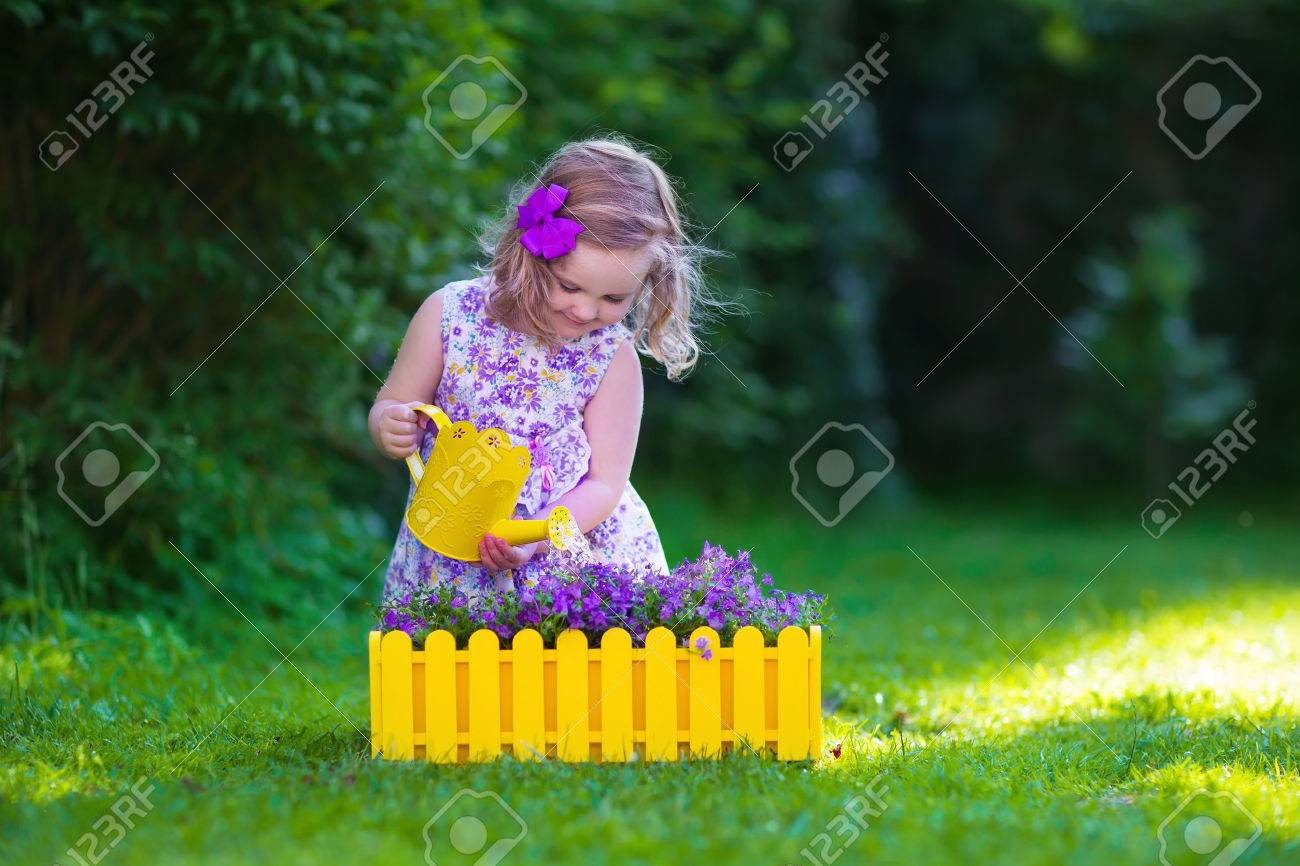 Immagini Stock Bambino Che Lavora In Giardino Bambini Giardinaggio Bambini Annaffiare I Fiori Bambina Con Acqua Puo Su Un Prato Verde Nel Cortile In Estate Bambino Bambino Che Gioca All Aperto Piantando