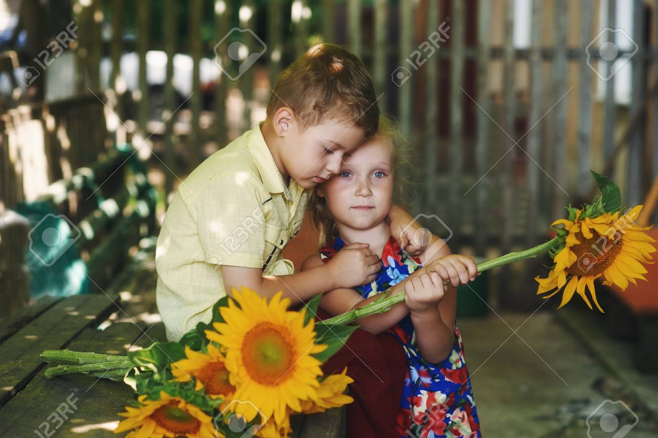 Immagini Stock L Amicizia E L Amore Dei Bambini Ragazzo Con Fiori Di Girasole Per Le Ragazze Image 81697479