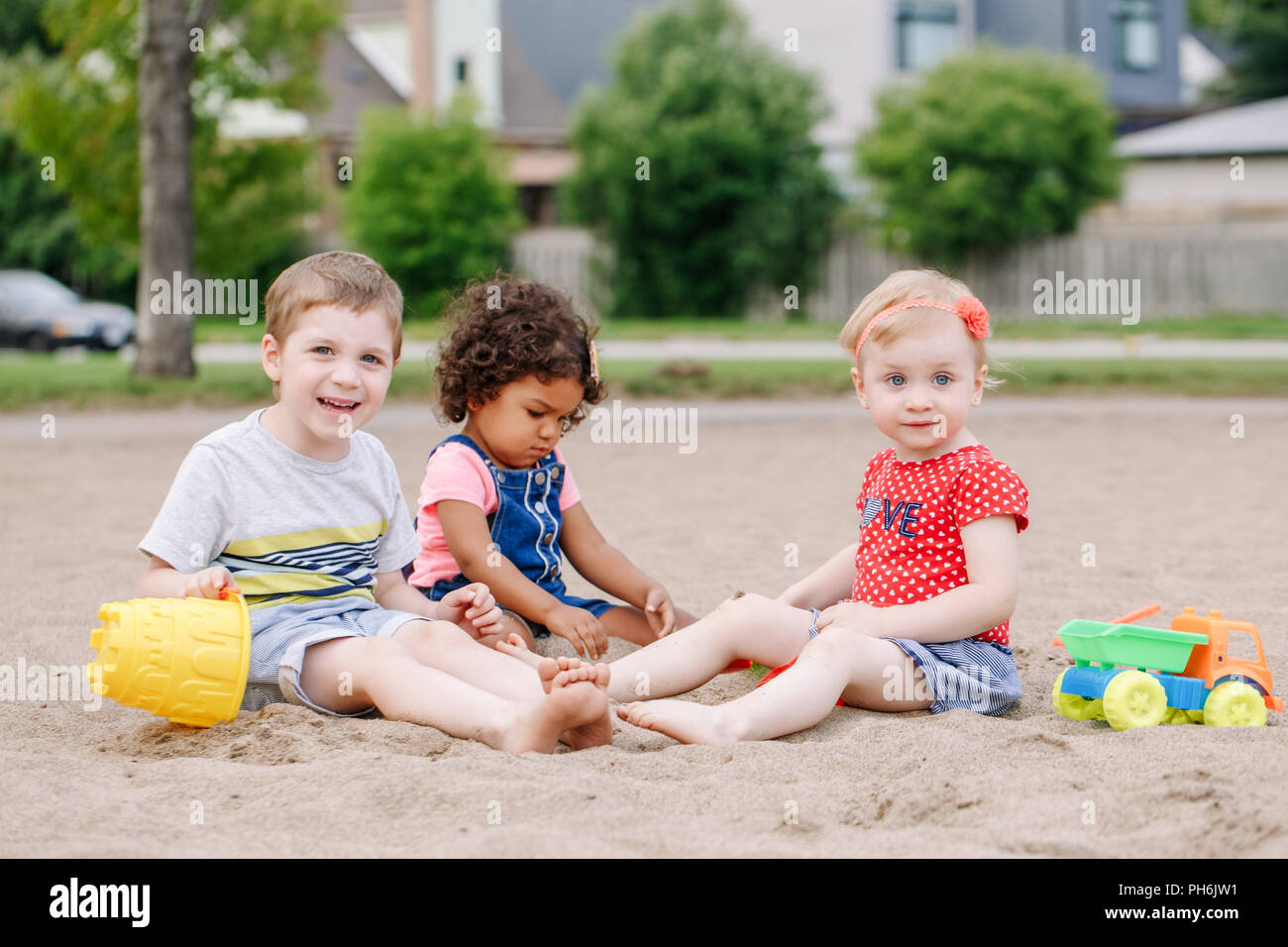 Ritratto Di Tre Simpatici E Caucasici Latino Ispanica Bambini Neonati Bambini Seduti In Sandbox Giocando Con Plastica Giocattoli Colorati Bambine E B Foto Stock Alamy