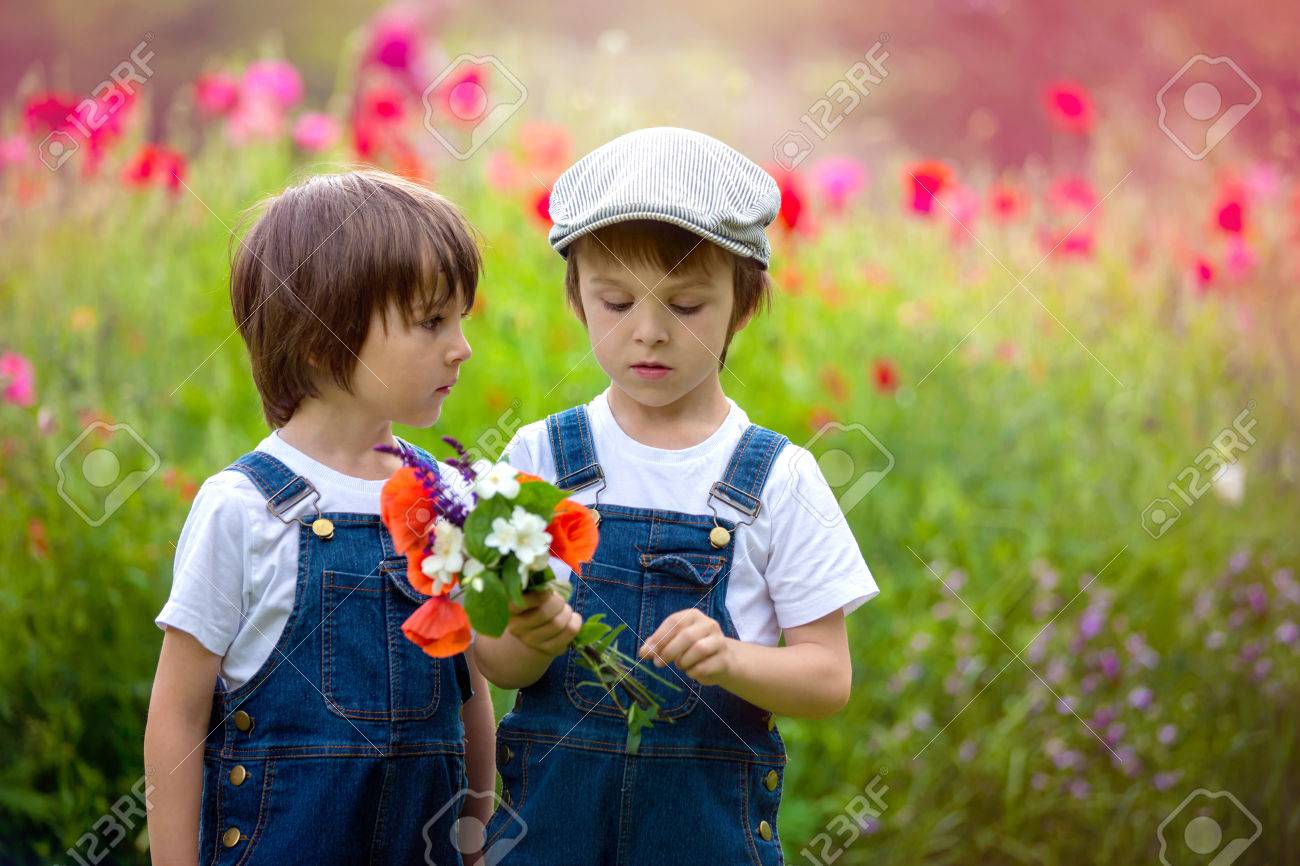 Immagini Stock Due Simpatici Bambini In Eta Prescolare Fratelli Ragazzo In Campo Di Papaveri In Possesso Di Un Mazzo Di Fiori Selvatici Sorridente Image 65247014