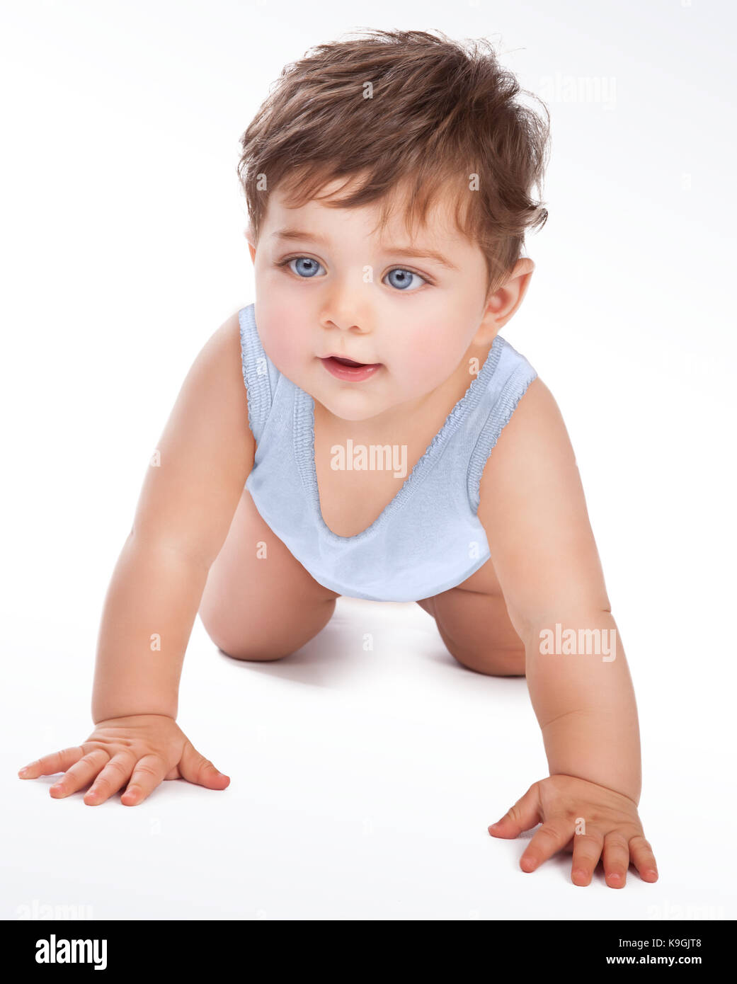 Carino Piccolo Bimbo Gattona In Studio Isolato Bianco Su Sfondo Grigio Gioiosi Bambini Che Giocano Felice Infanzia Sani Foto Stock Alamy