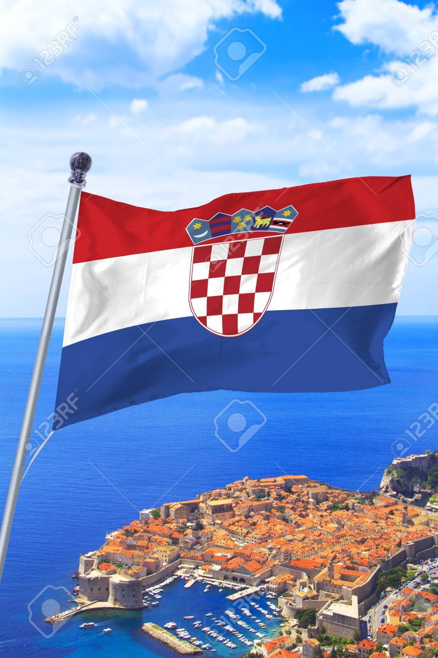 Immagini Stock Bella Vista Della Citta Storica Di Dubrovnik Sotto La Bandiera Della Croazia In Una Giornata Di Sole Image 83087488