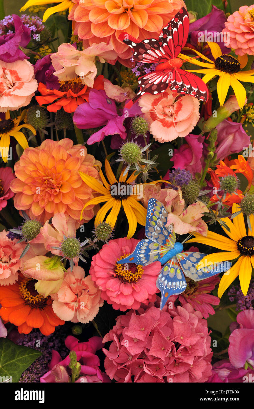 Un Molto Vivacemente Colorato Bellissimo Display Di Varie Specie Di Fiori E Fiorisce In Un Bouquet Di Fiori Con Colorate Farfalle Artificiali Nella Disposizione Foto Stock Alamy