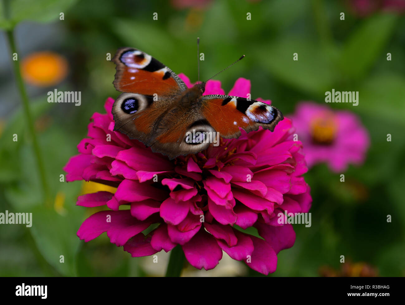 Una Farfalla Con Un Bellissimo Colore Brillante E Seduta Su Un Fiore Rosa Su Sfondo Colorato Di Un Giardino Nel Villaggio Foto Stock Alamy