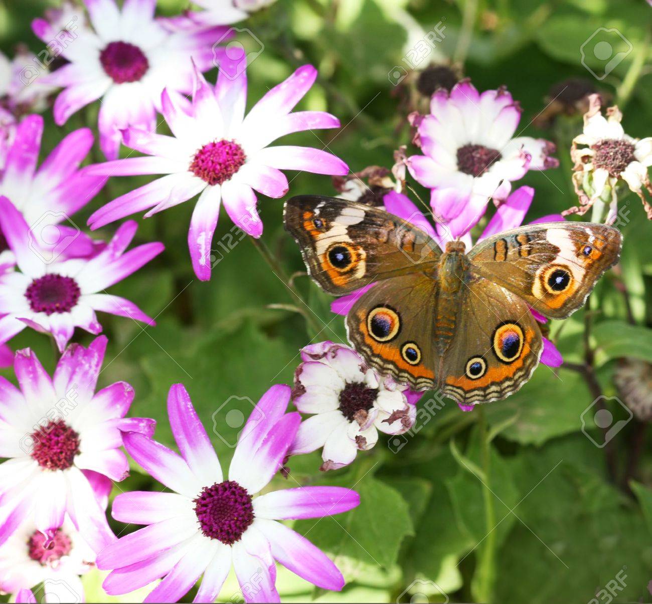 Immagini Stock Una Bellissima Farfalla Buckeye Riposo Su Un Fiore Junonia Coenia Il Buckeye E Un Azienda Di Medie Dimensioni Con Due Grandi Farfalle Multicolori Eyespots Su Hindwings E Una Grande Eyespot
