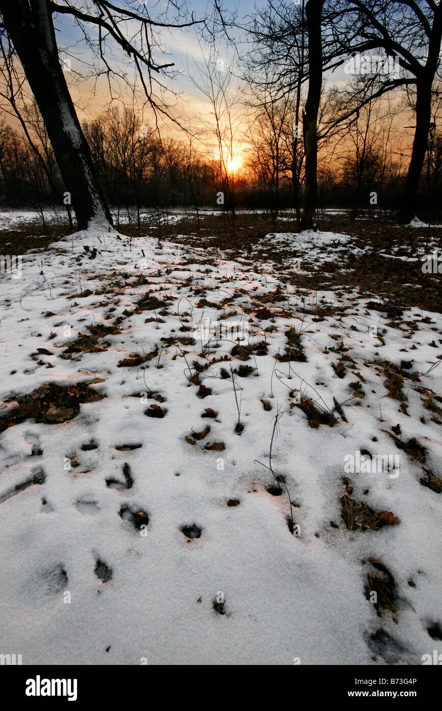 Tramonto In Un Bosco Innevato Punti Di Luce E Ombre Ad Albero Sulla Neve Foto Stock Alamy