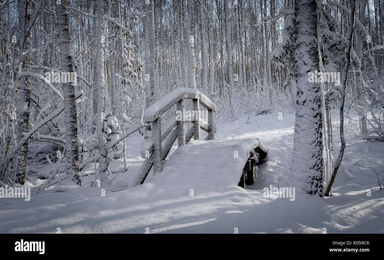 Bella Coperta Di Neve Ponte Ad Arco Oltre Un Flusso In Inverno Bosco Innevato Con Tronchi Di Alberi In Un Suggestivo Paesaggio Invernale Concettuale Del Le Stagioni Foto Stock Alamy