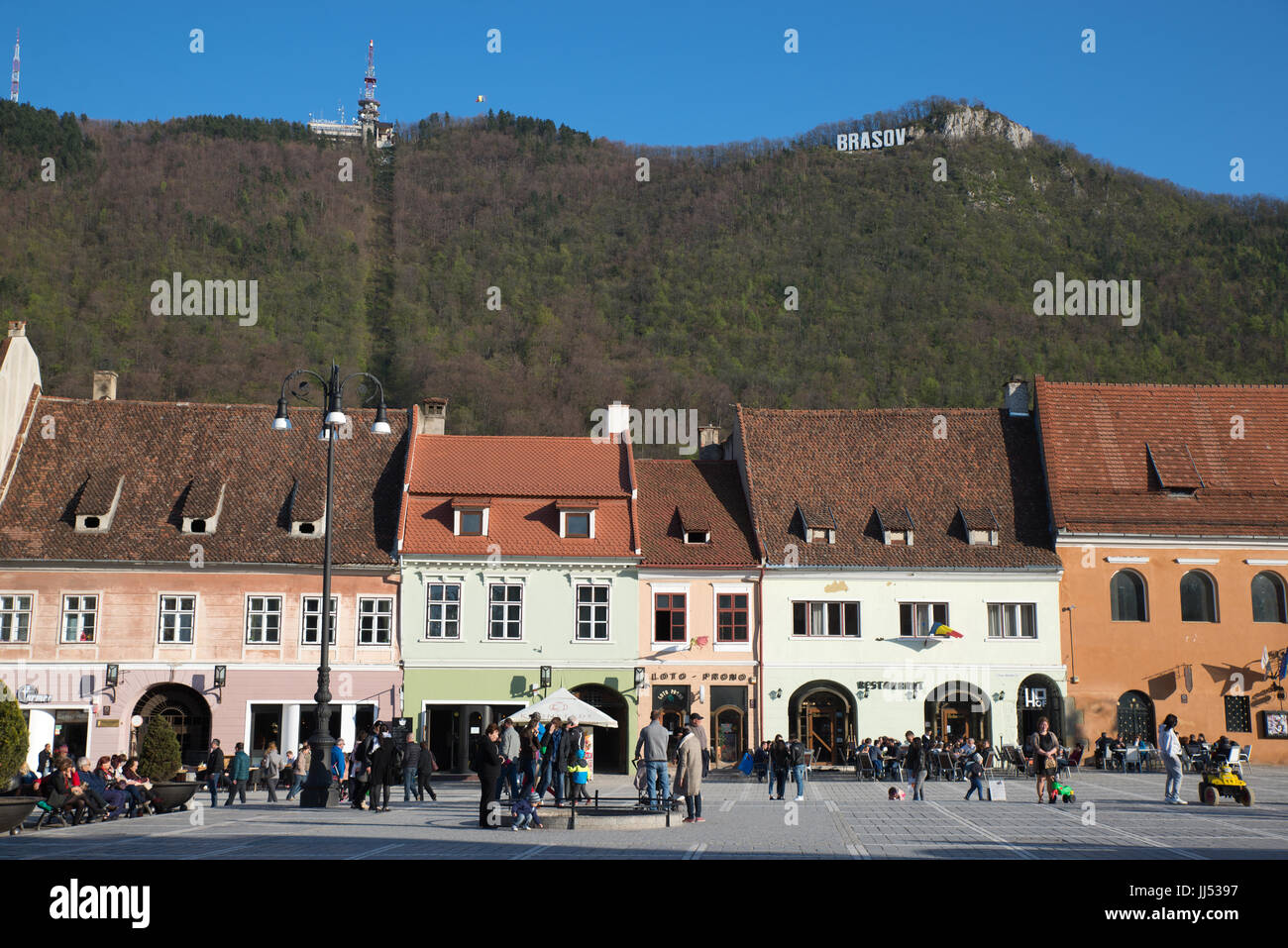 Vista Della Piazza Del Consiglio Piata Sfatului Con Segno Di Brasov In Montagna Brasov Romania Foto Stock Alamy