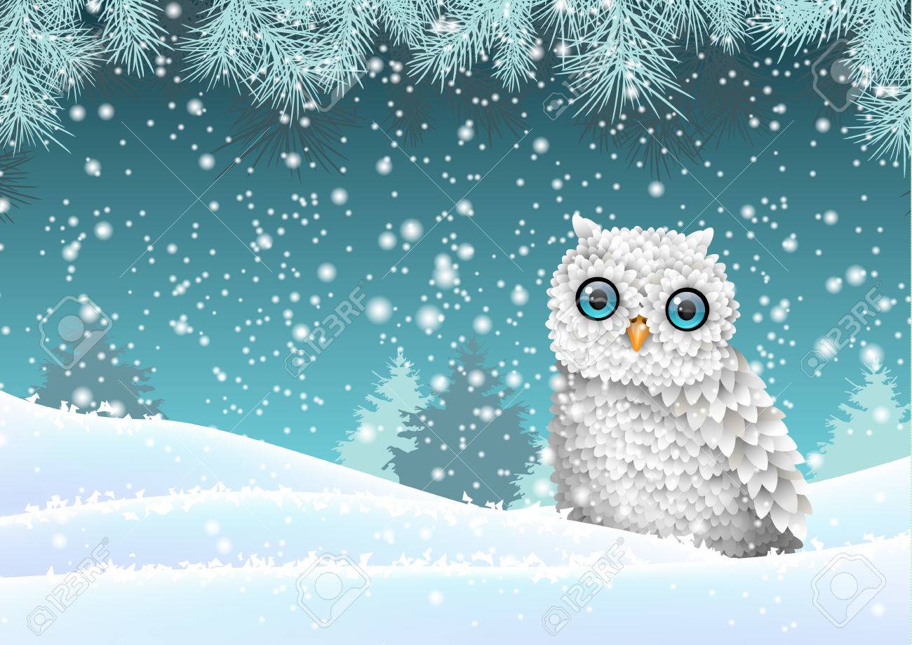 Vettoriale Tema Di Natale Gufo Bianco Sveglio Che Si Siede Nella Neve Davanti Al Paesaggio Piu Forrest Nevoso Di Inverno Illustrazione Di Vettore Image 63536542