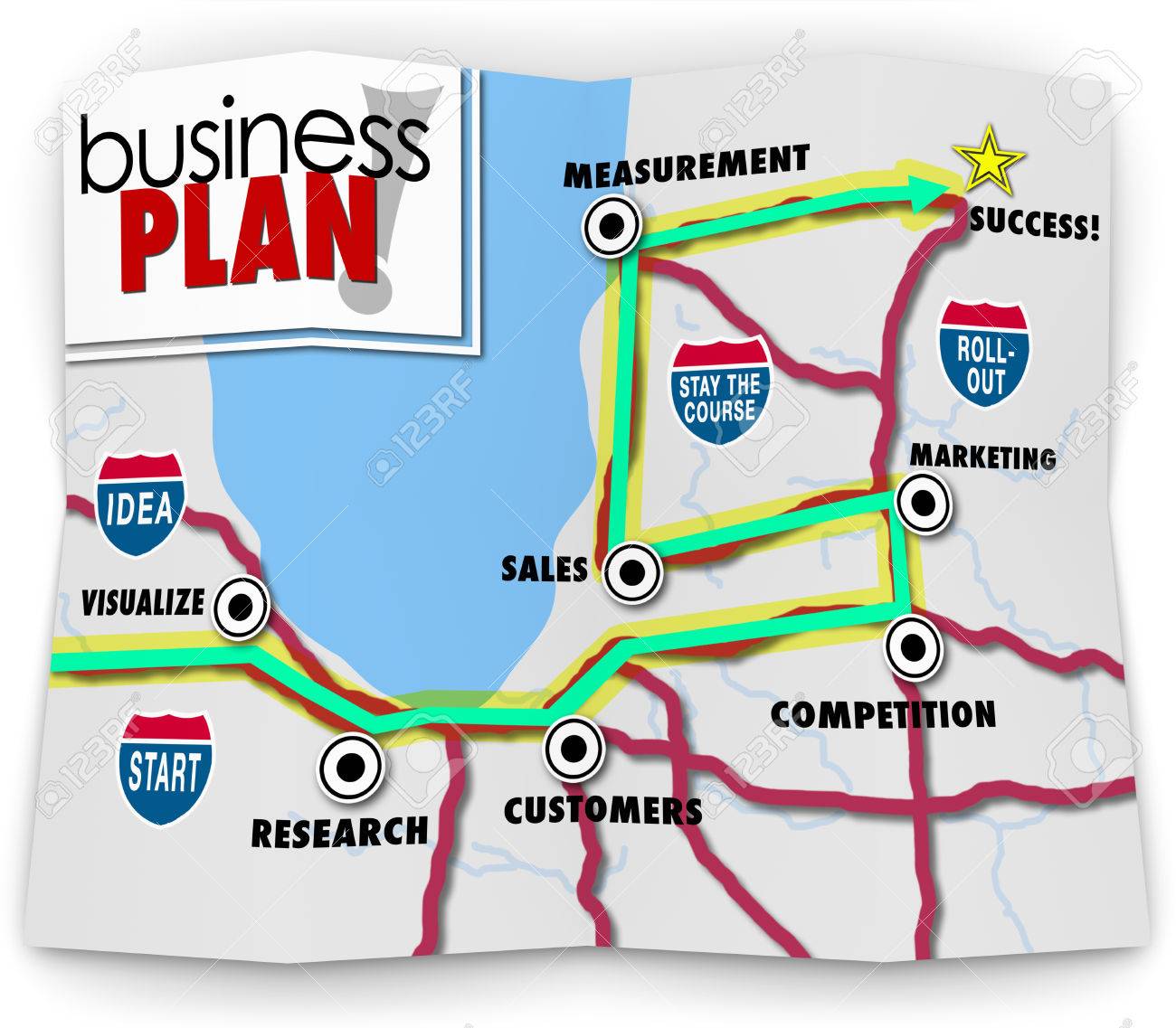 Immagini Stock Parole Di Business Plan Su Una Mappa Stradale Che Indirizza Verso Il Successo Per Una Societa Di Avvio Con Le Indicazioni Che Porta A Visualizzare La Ricerca I Clienti
