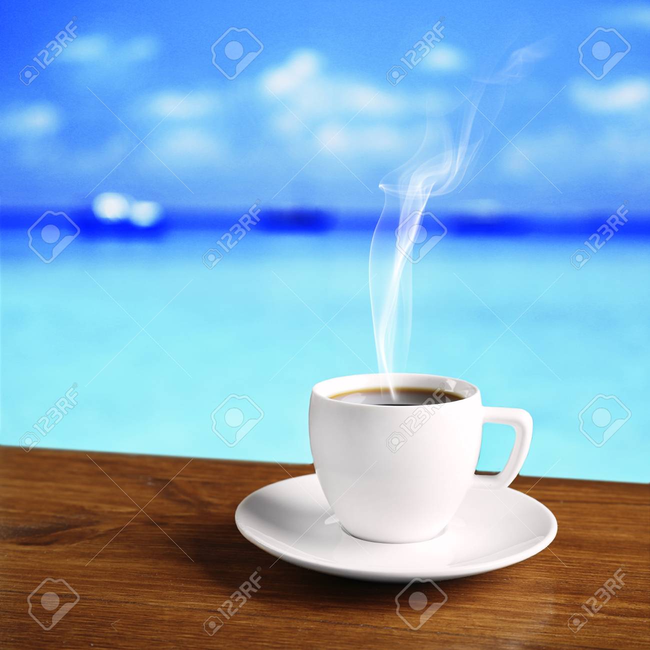 Cup Of Coffee On Table On Sea Background Stock Photo Picture And Royalty Free Image Image 46598775
