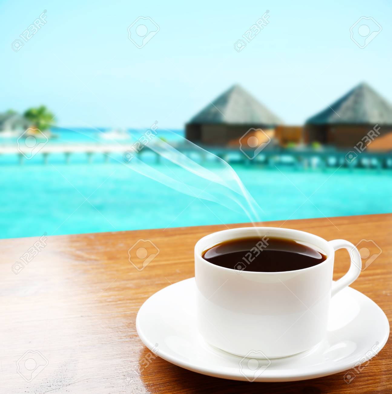 Immagini Stock Tazza Di Caffe Vicino Al Mare Sulla Spiaggia E Piscine Image 10771065