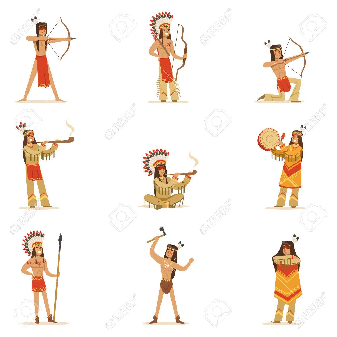 Vettoriale Nativi Americani Membri Della Tribu In Una Delle Tradizionali Indiani Di Abbigliamento Con Armi E Altri Beni Culturali Insieme Di Caratteri Dei Cartoni Animati Image 70991501
