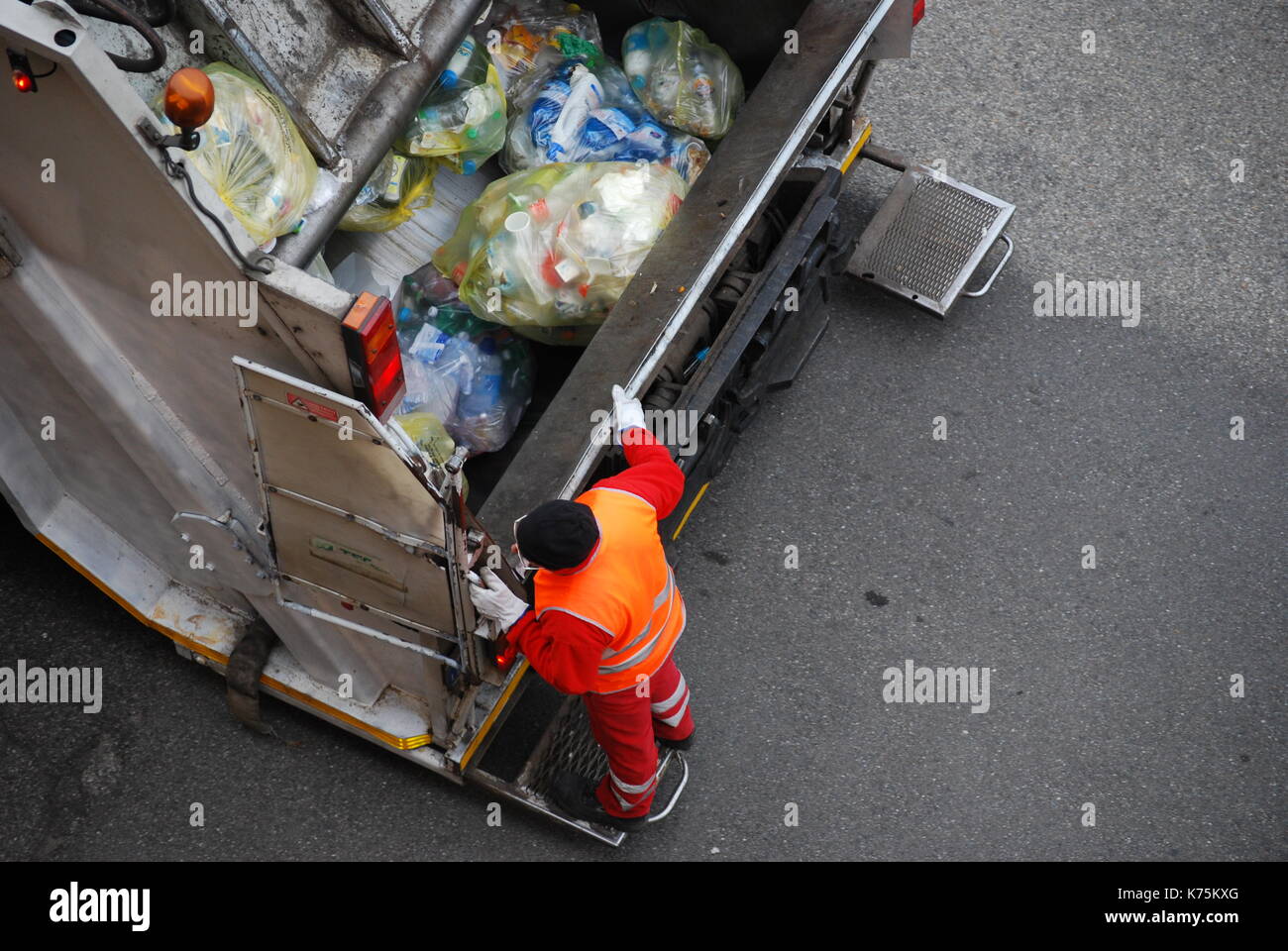 Garbage Man A Lavorare Sul Camion Della Spazzatura Foto Stock Alamy