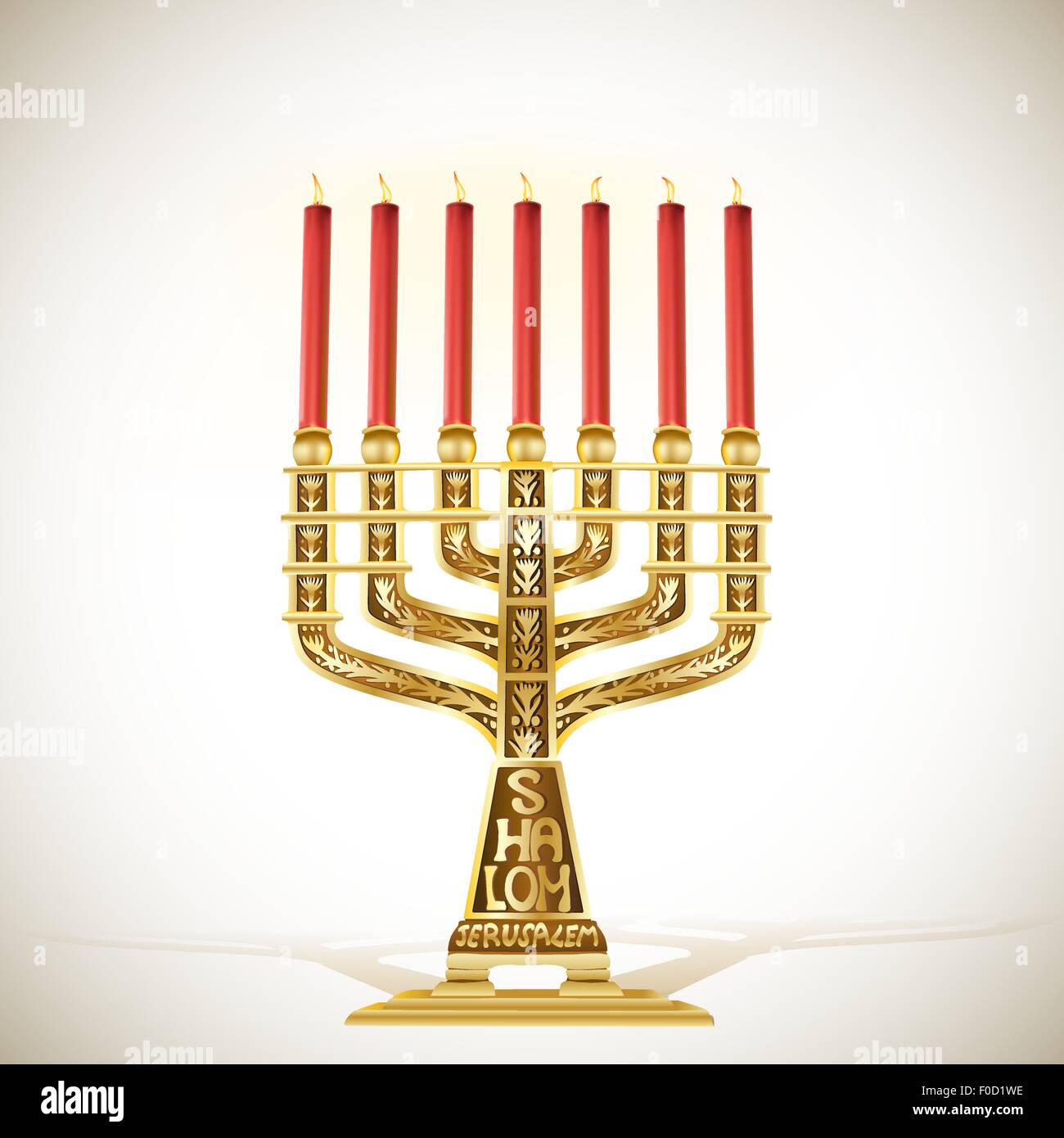 Menorah Dorato Dell Ebreo Con Judaism Ortodosso Ebraico Di Chanukah Della Fiamma E Del Candelabro Della Decorazione Di Tradizione Illustrazione Vettoriale Illustrazione Di Hanukkah Luce 87632061