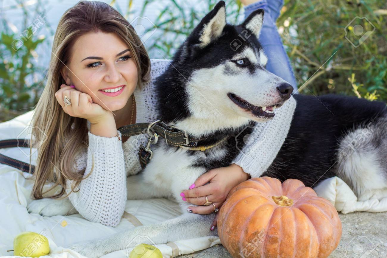 Immagini Stock Piuttosto Giovane Ragazza E Il Suo Cane Husky Blueyed E Sdraiato All Aperto Vicino Al Lago Con Zucca E Mele Autunno Image 46203221