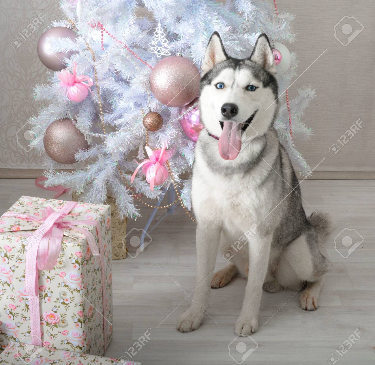Immagini Stock Cane Husky Da Un Regalo Per Natale Image 50570488