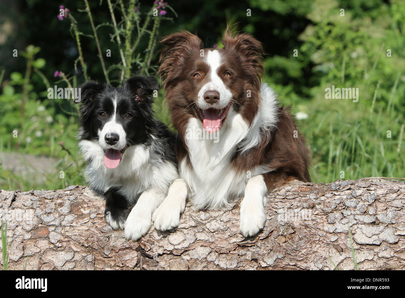 Cane Border Collie Adulto E Cucciolo Diversi Colori Giacente Su Di Un Tronco Di Albero Foto Stock Alamy