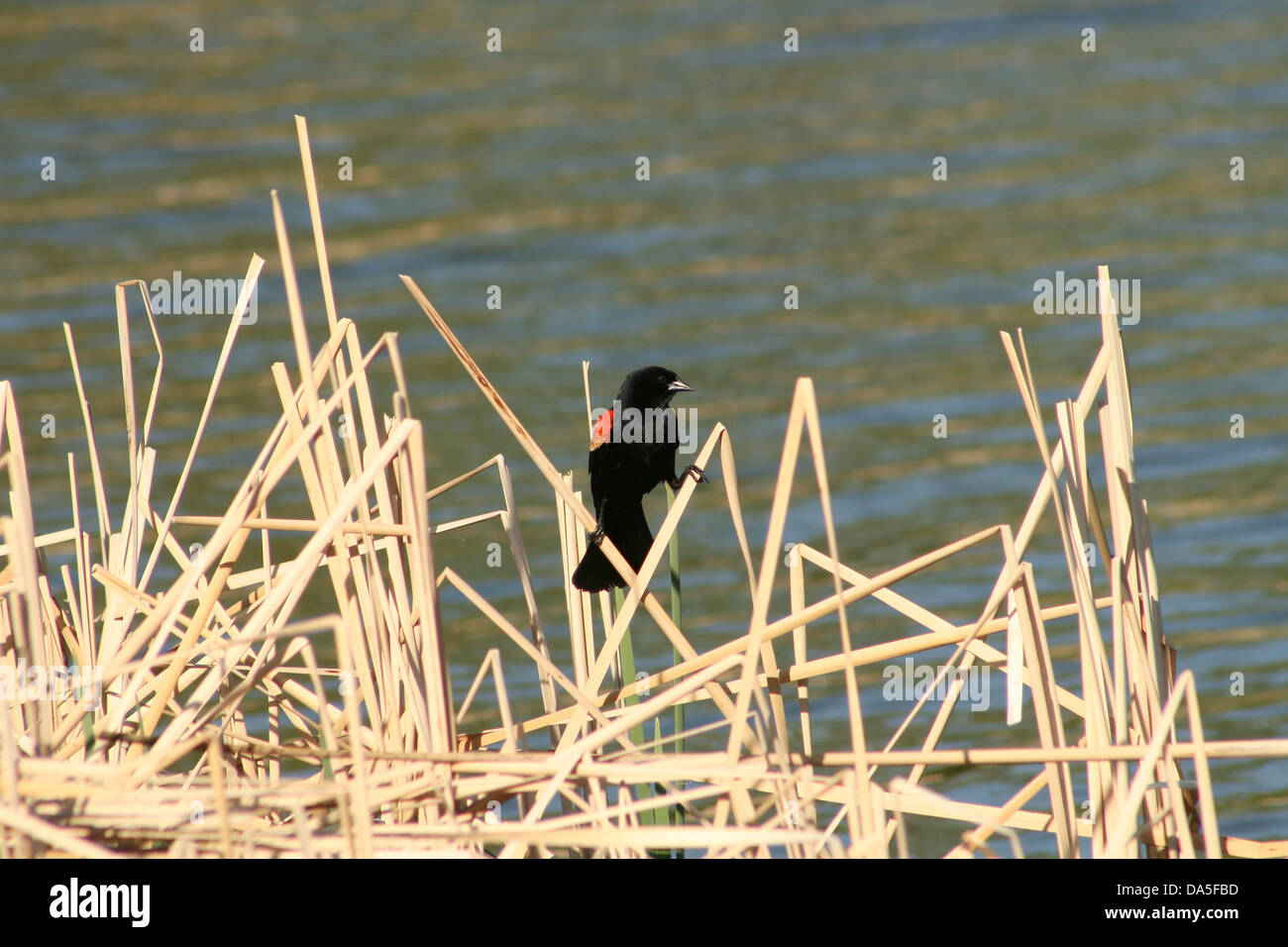 Un Maschio Rosso Winged Blackbird Appollaiato Su Canne Palustri In Una Palude In Primavera A Winnipeg Manitoba Canada Foto Stock Alamy
