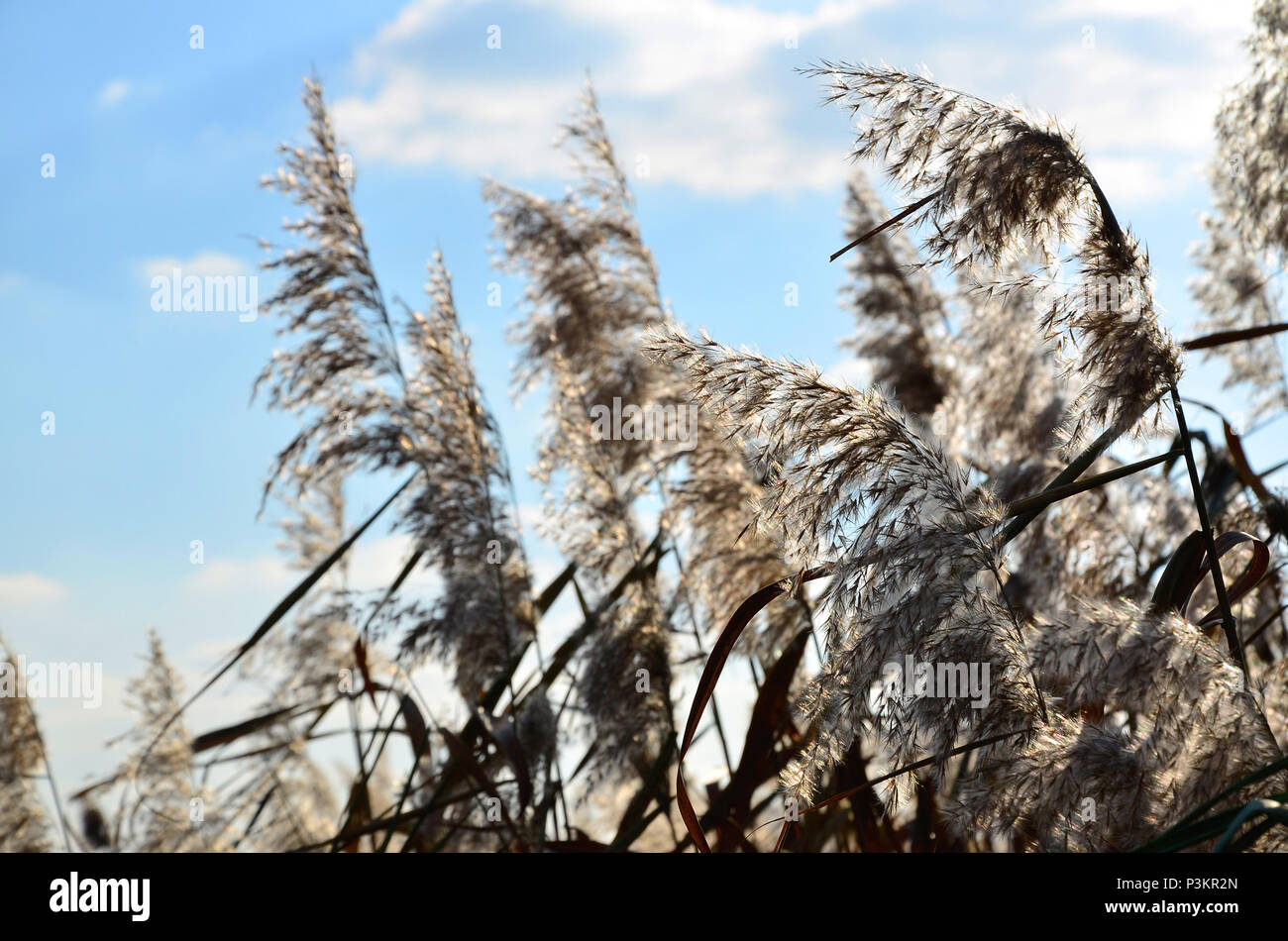 Canne Palustri Giallo Lanuginoso Ance Contro Il Cielo Blu E Chiaro Nelle Ore Diurne Foto Stock Alamy
